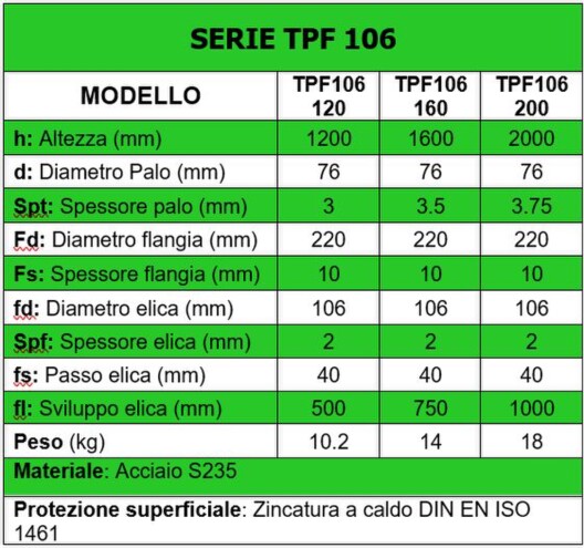Sono fondazioni con spira di diametro 106 mm. Presentano una flangia circolare in testa, con un foro centrale filettato e sei asole sul perimetro.